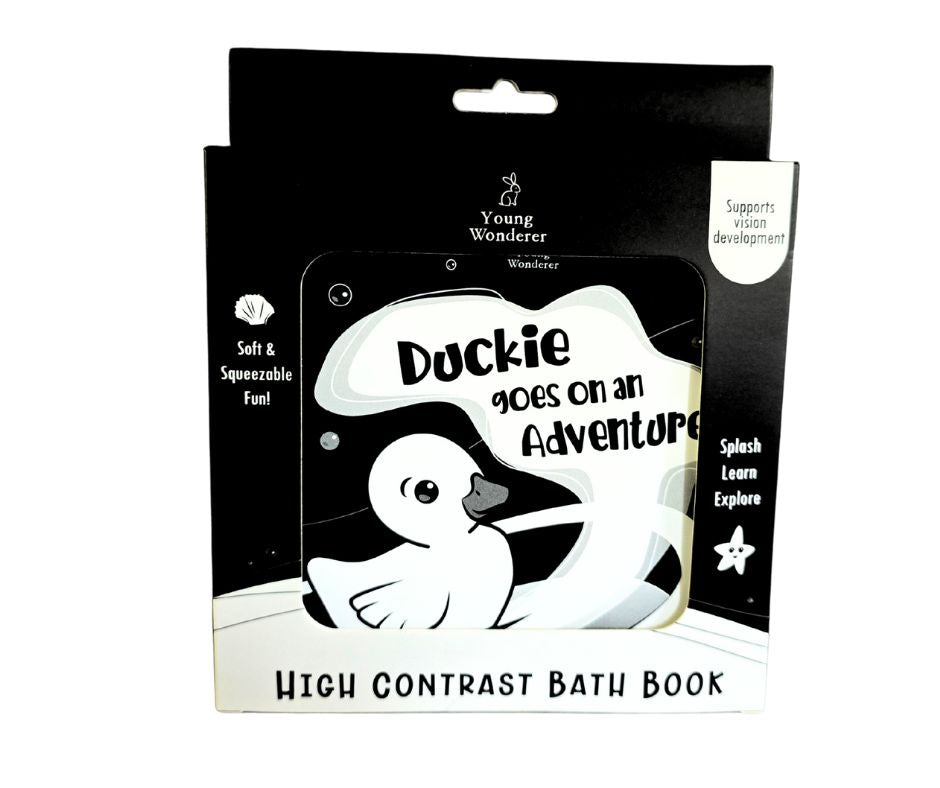Duckie Goes On An Adventure is a waterproof black and white bath book designed to support your baby’s vision development while making bathtime more engaging and hands-free.